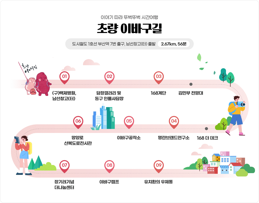 특히 계단을 따라 설치된 초량168계단 하늘길(경사형 엘리베이터)은 초량이바구길의 새로운 랜드마크이다.